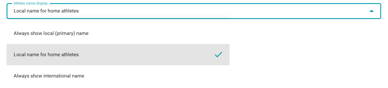 7. In the Athlete name display field, decide how the athletes' names should be displayed in all places related to the competition (e.g. start lists and results).