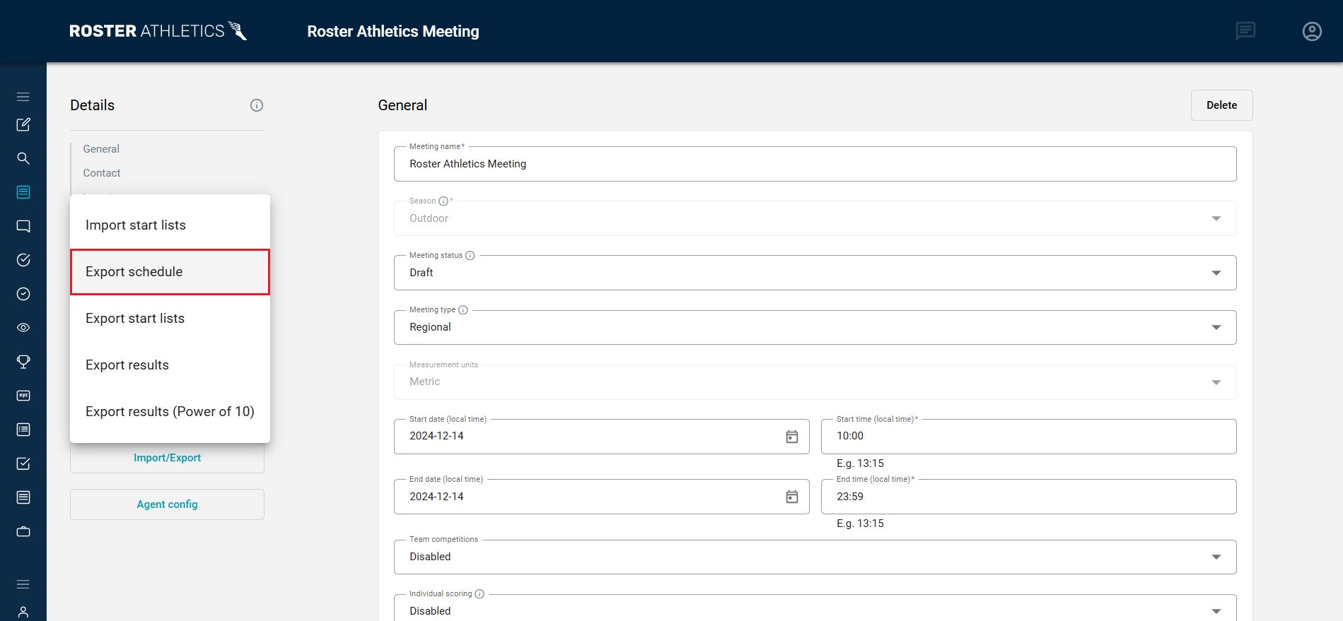 The Export CSV tool, located on the left side of the Details page, allows you to save the entire competition schedule as a CSV file.