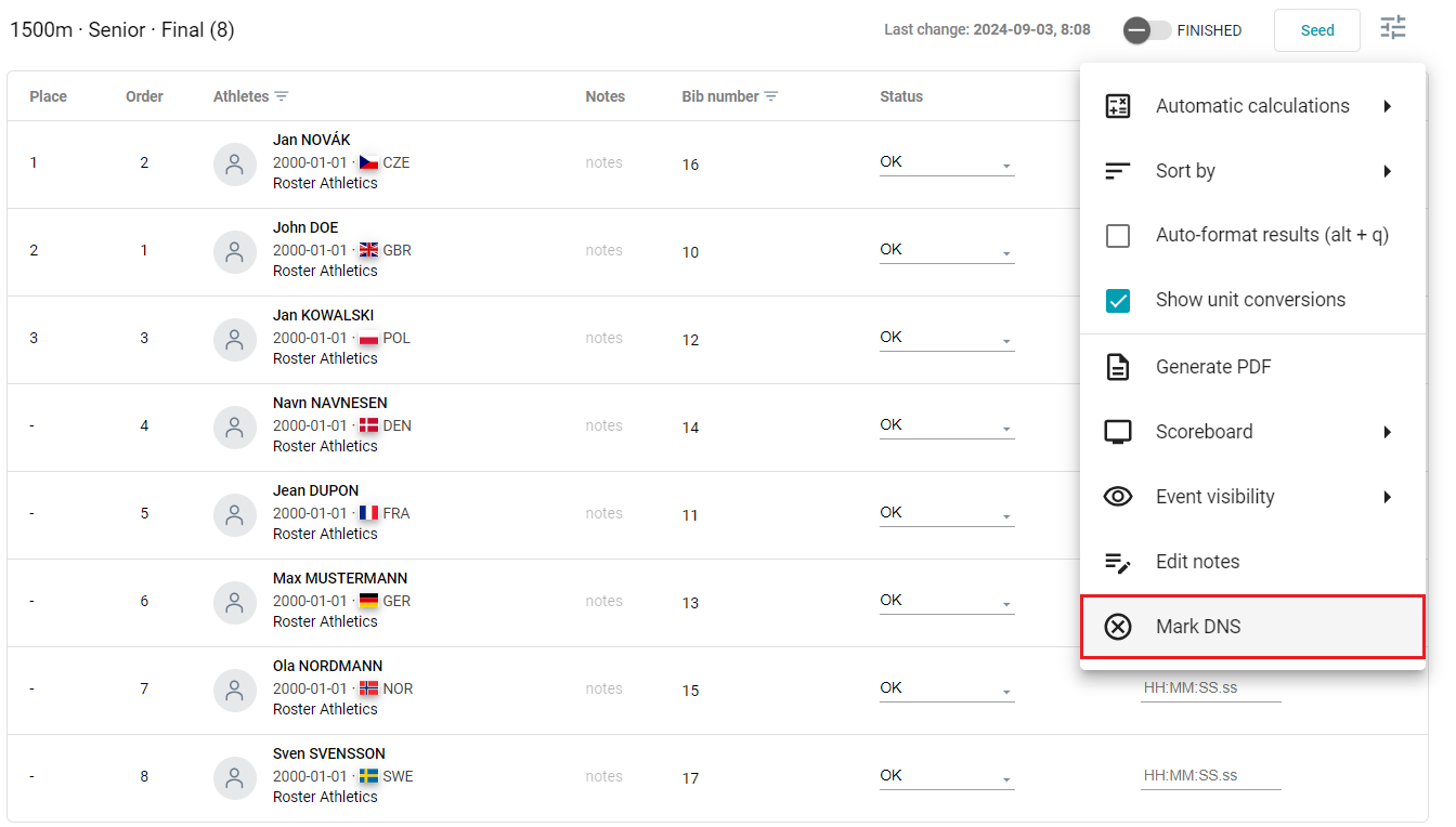 You can collectively mark all participants without a result as DNS. To do so, select Mark DNS from the options menu.
