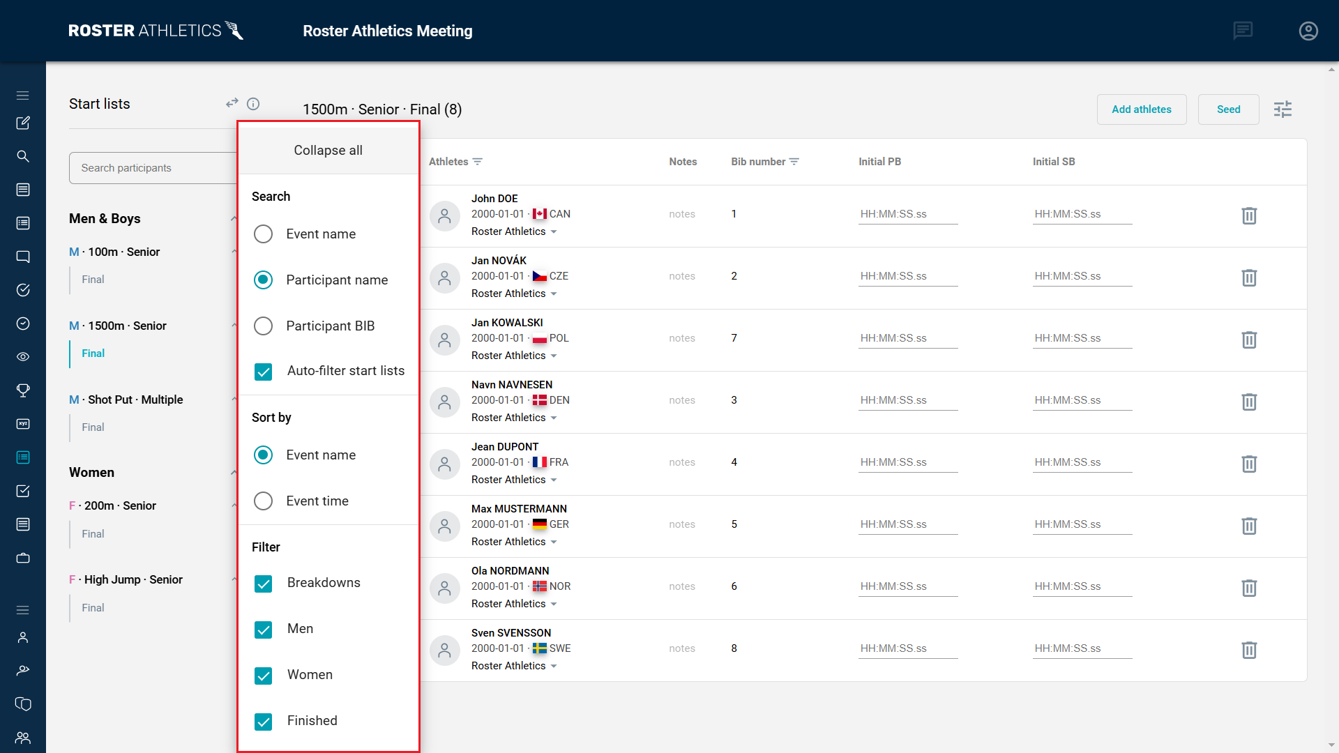 You can also search for participants directly on the start list by clicking Athletes and entering the participant's name. The same option is available for Bib number.