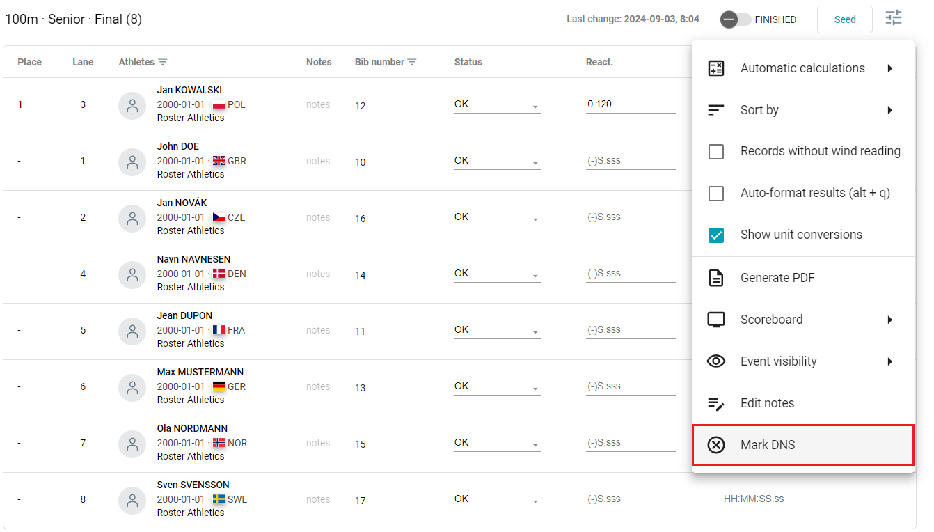 You can collectively mark all participants without a result as DNS. To do so, select Mark DNS from the options menu.