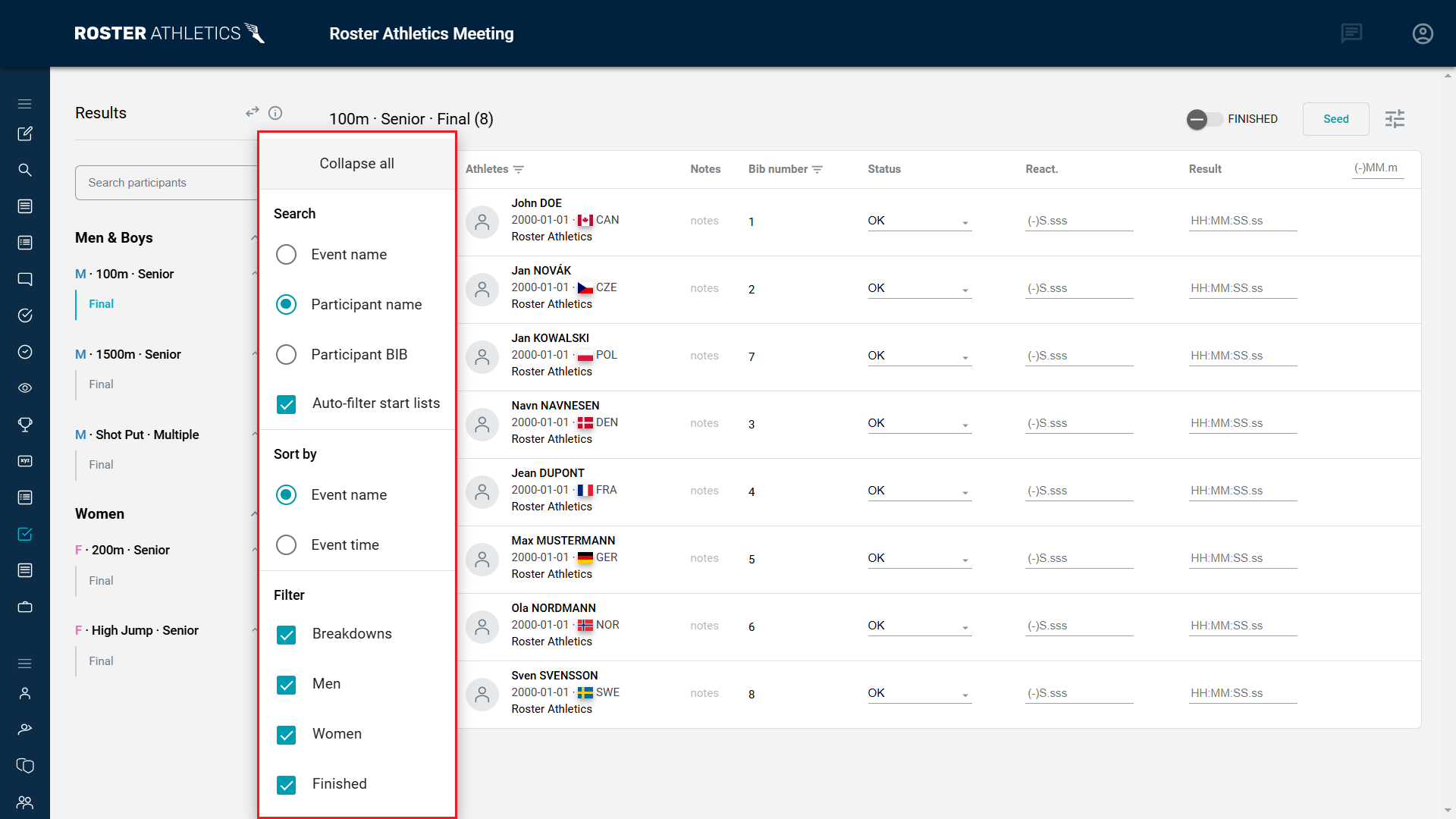 You can also search for participants directly on the start list by clicking Athletes and entering the participant's name. The same option is available for Bib number.