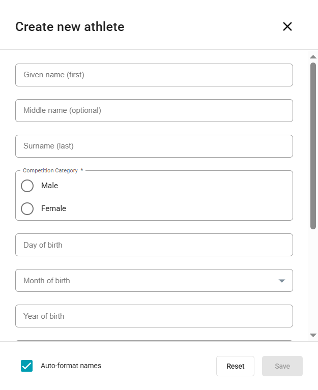 To add a new athlete, you must add the Given/First name, Surname/Last name and select the applicable Gender and Country (all these fields are mandatory). You can also add a Middle name, a full Birthday (Day, Month, Year) or only the year if you only know the birth year.