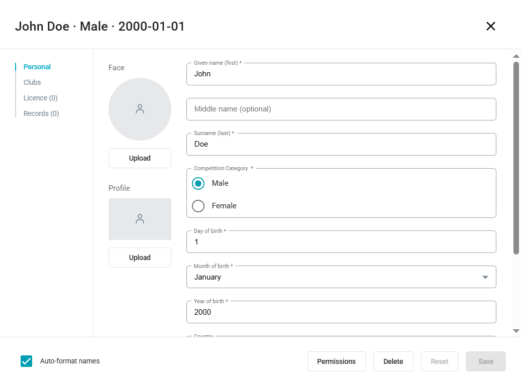 6. If you have added a new athlete correctly, you will see a window with a menu containing Personal, Clubs, License/Licence, and Records links. The Permissions button will also appear at the bottom of the page.