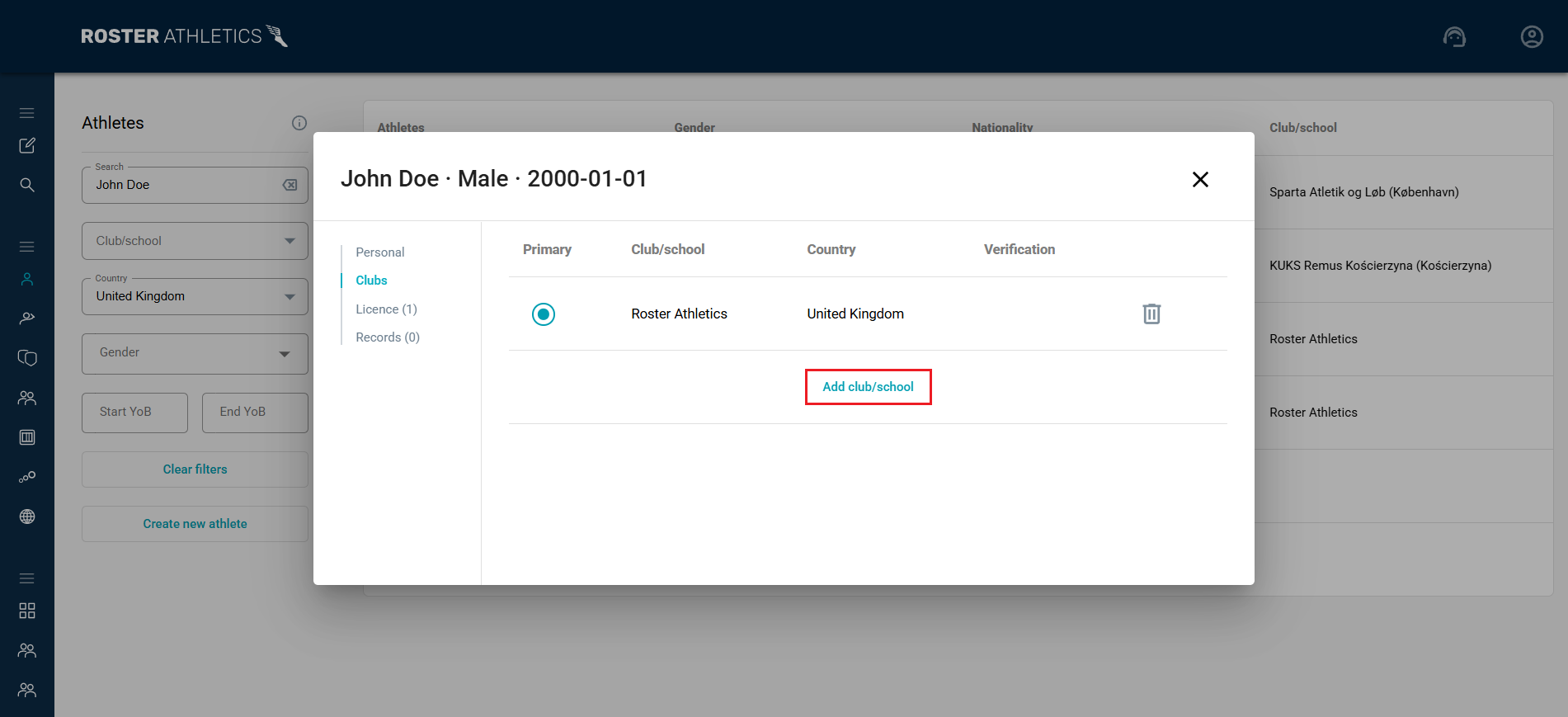 You can add a new club or school to the Roster Athletics database from an athlete, relay, or team profile, or from OVERVIEW → Clubs/schools in the left-hand side menu. Depending on the place, follow these steps: