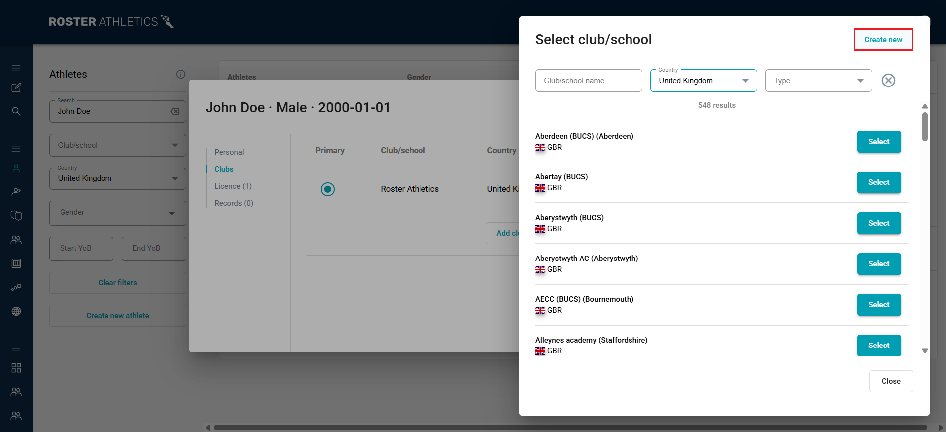 To add a new club or school from an athlete, relay, or team profile, go to the Clubs (Athlete profile) or General (Relay team profile) tab and click Add club/school button, then click Create new.