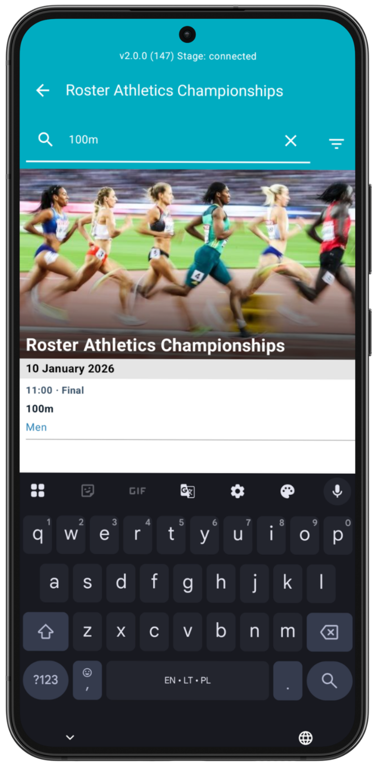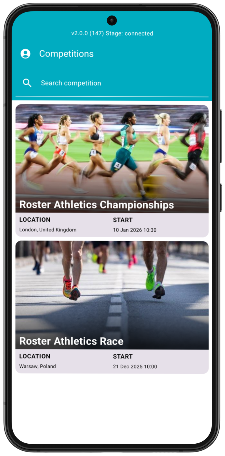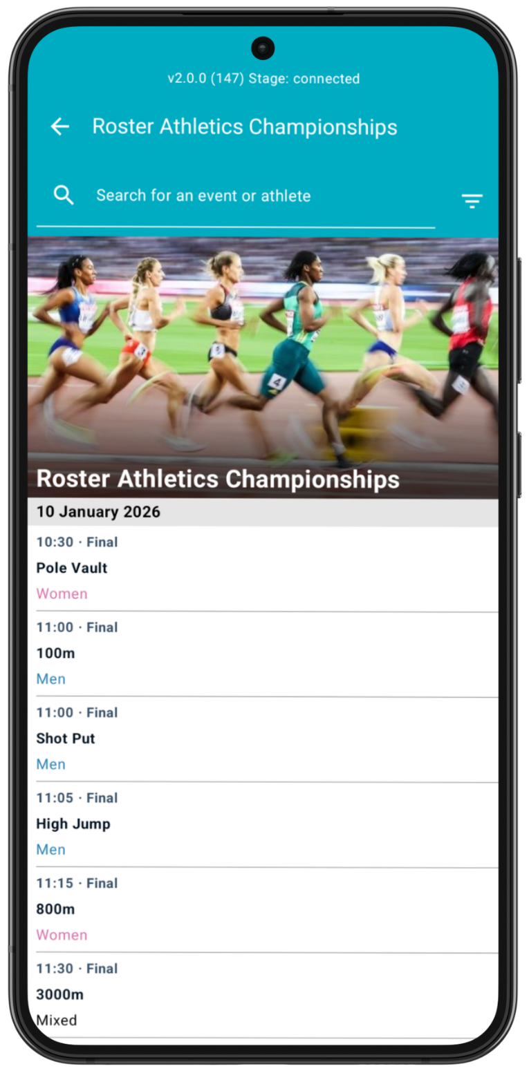 Welcome to the Roster Athletics: Meet Mgmt App User Guides. The app is available on both the iOS App Store for Apple iPhone and iPad devices, as well as the Google Play Store for Android devices. The app integrates with Roster Athletic’s Competition Management Platform, allowing competition organisers to enter live field results directly from their mobile device. The live field results are automatically transferred to the platform and directly into the main Roster Athletics App, allowing fans and athletes to follow these results in near real-time.