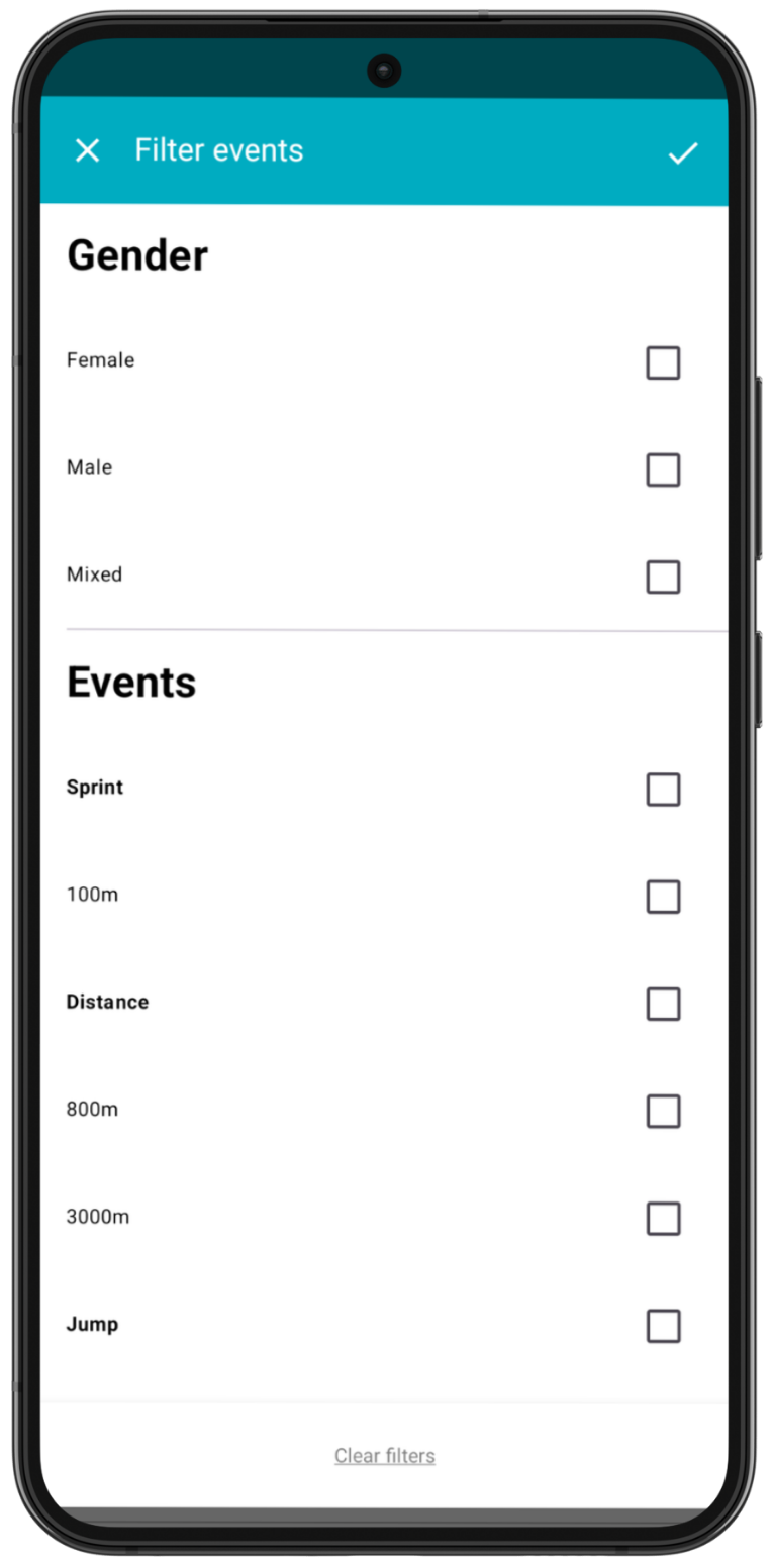 Use the search function to find a specific event (or set of events) or an athlete by name and quickly navigate to the event.