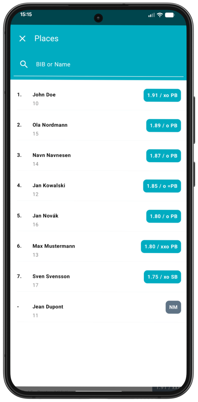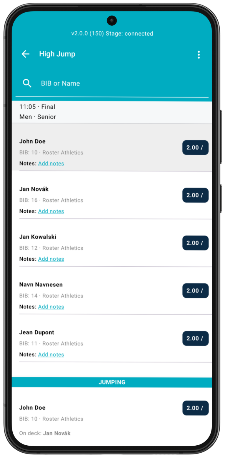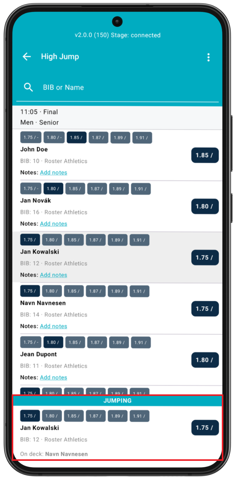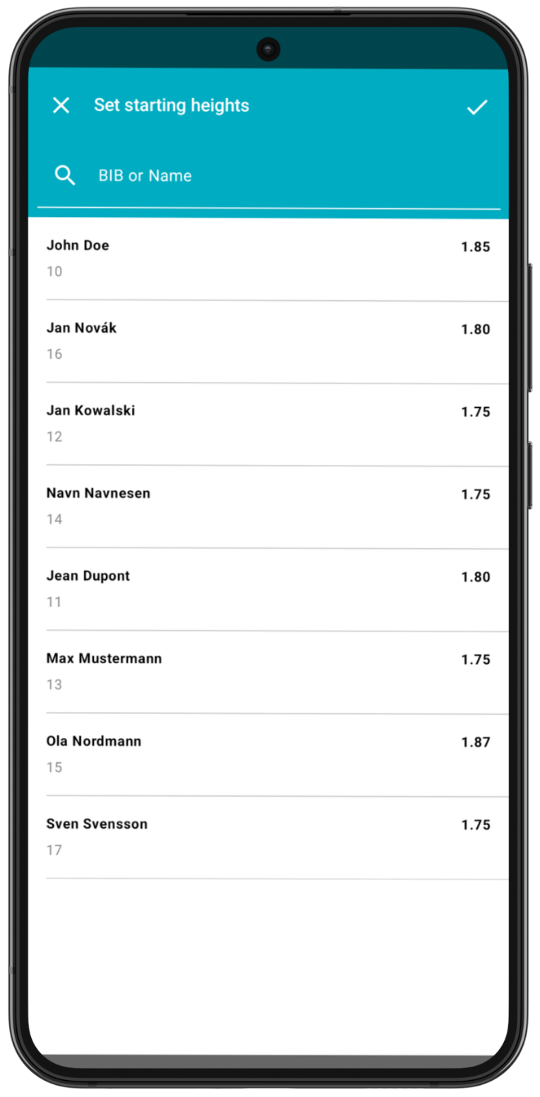 Once on the Set starting heights page, you will see the list of competing athletes. You can also search for the name or bib number of a competing athlete in this event.