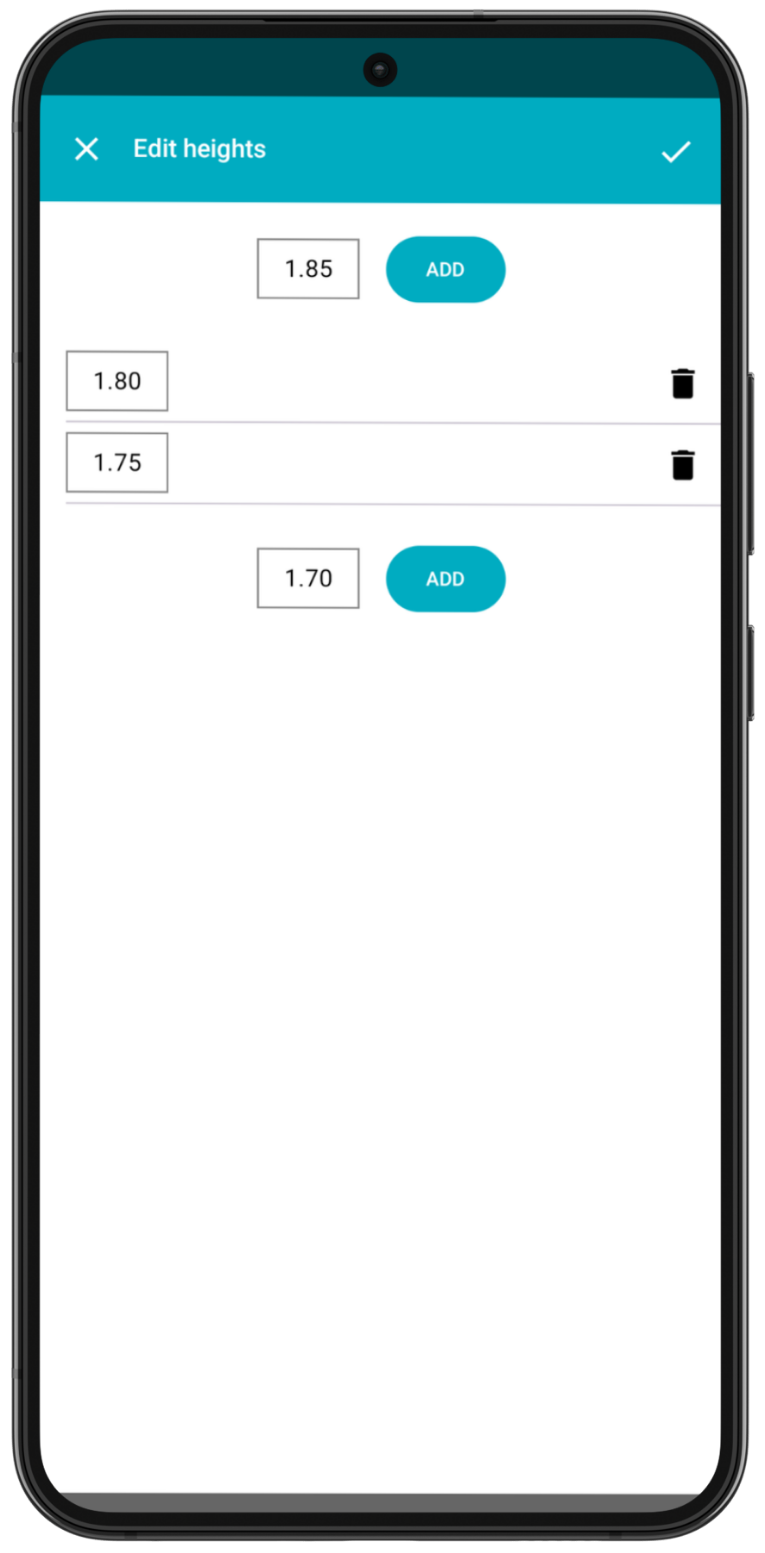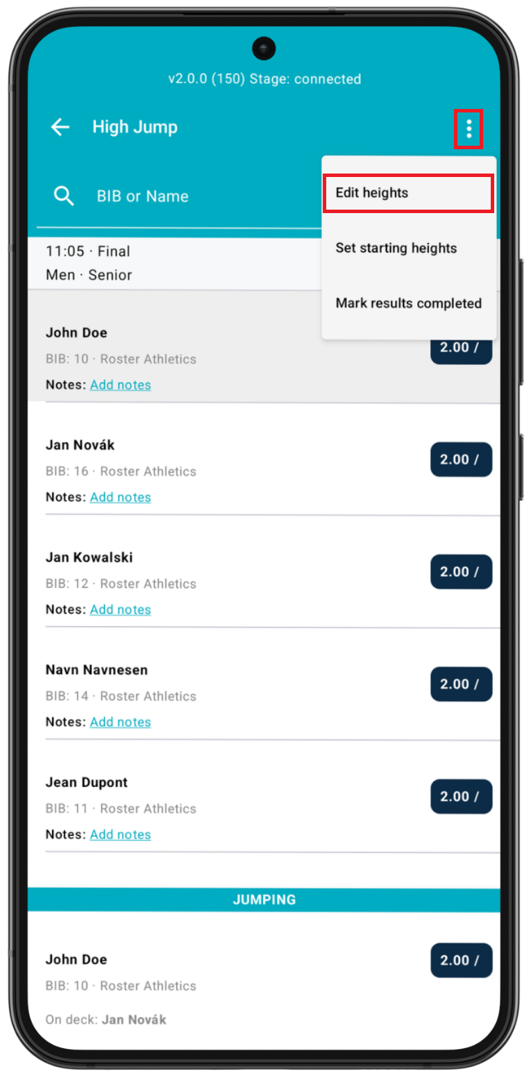 Please note that the heights can be edited or added at any time. You can also remove the first and last heights. The app will warn you if you try to remove a height at which athletes have attempted.