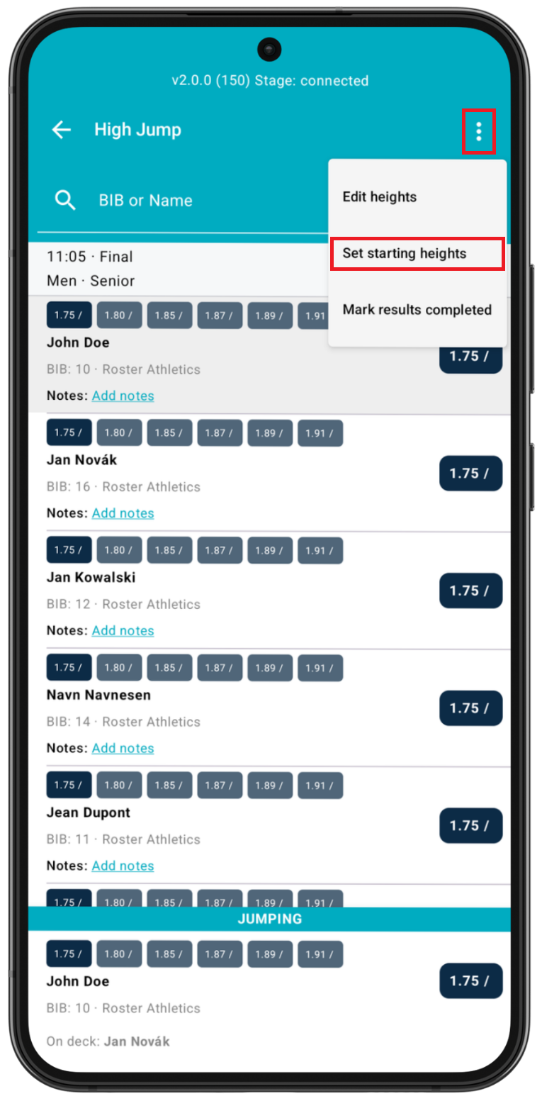 You can set the starting height for each athlete before the event begins. To do this, go to the three-dot menu and select Set starting heights.