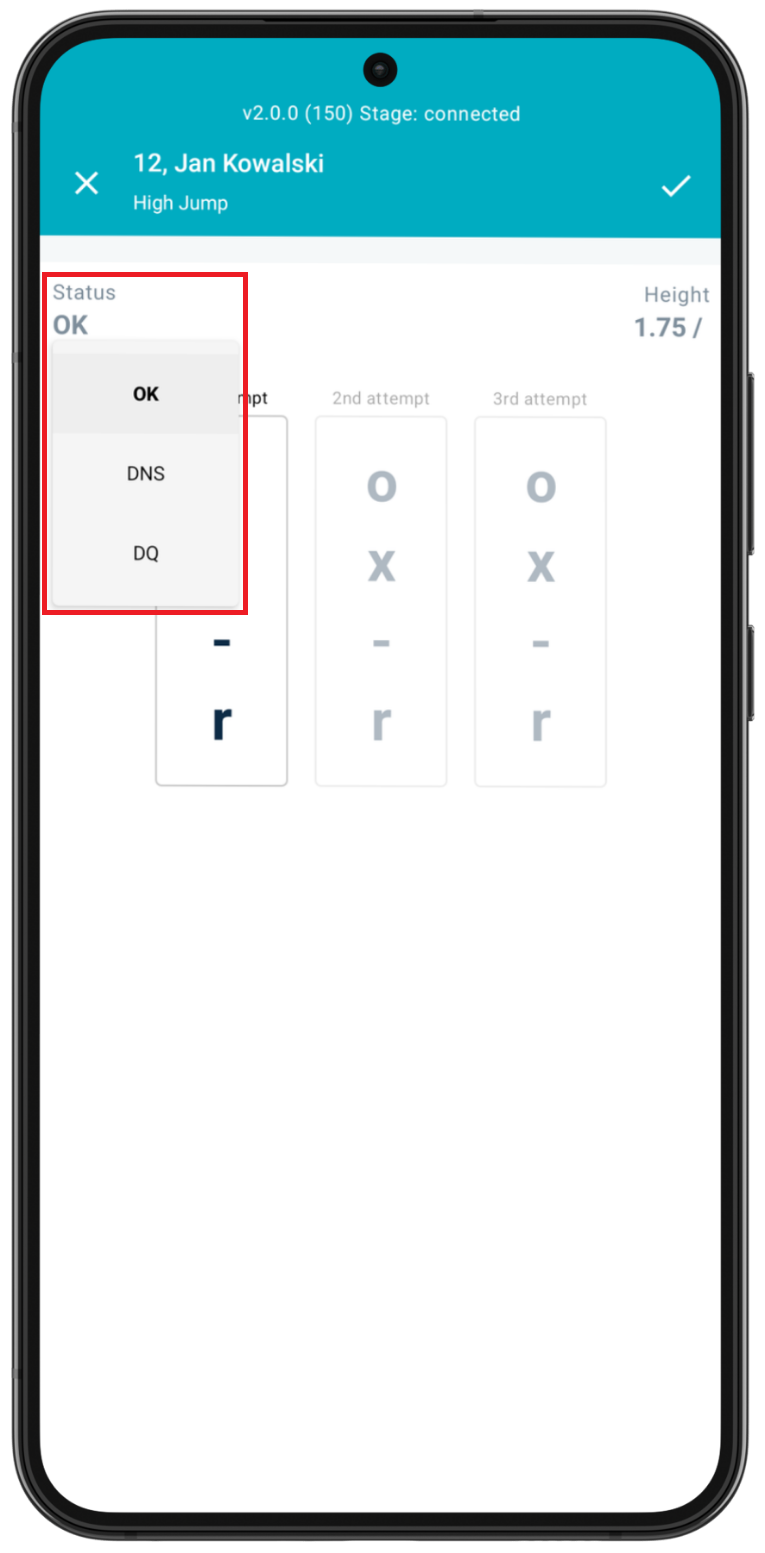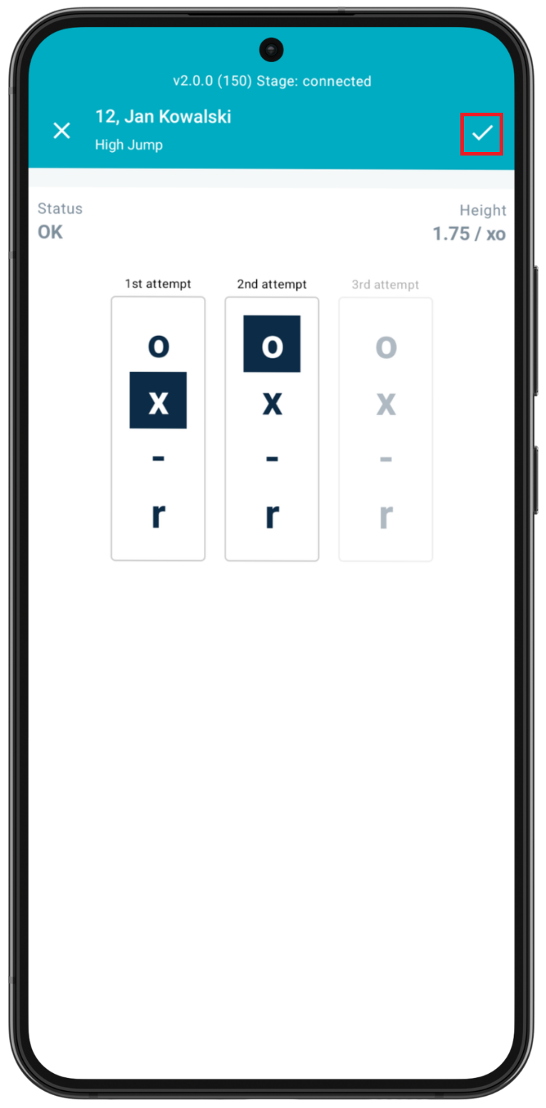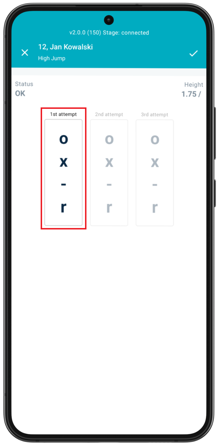 If marked with an o, the athlete moves to the next height and resets any misses. If marked with a x, the athlete stays at this height and goes back in the queue at this height for the next attempt, with the miss recorded (unless three x’s are marked consecutively, indicating that the athlete is now out of the competition). If - is marked, the athlete passes and moves onto the next height, but any missed attempts are kept. If r is marked, indicating that the athlete has retired from the event, then this athlete will no longer appear in the jumping field.