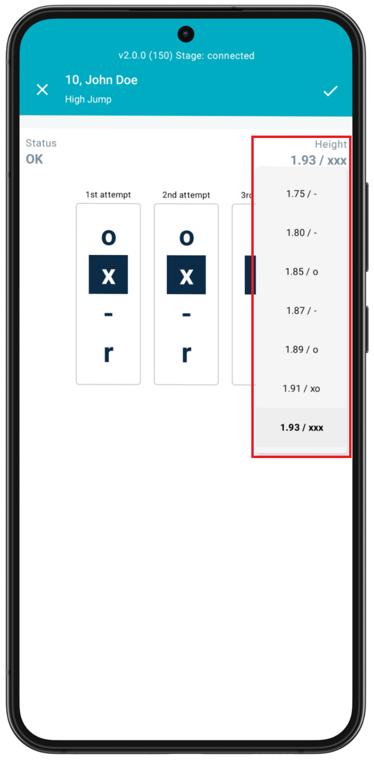 Select an athlete and choose their desired starting height from the list of event heights displayed. If you have not previously set the event heights, please follow the instructions above.