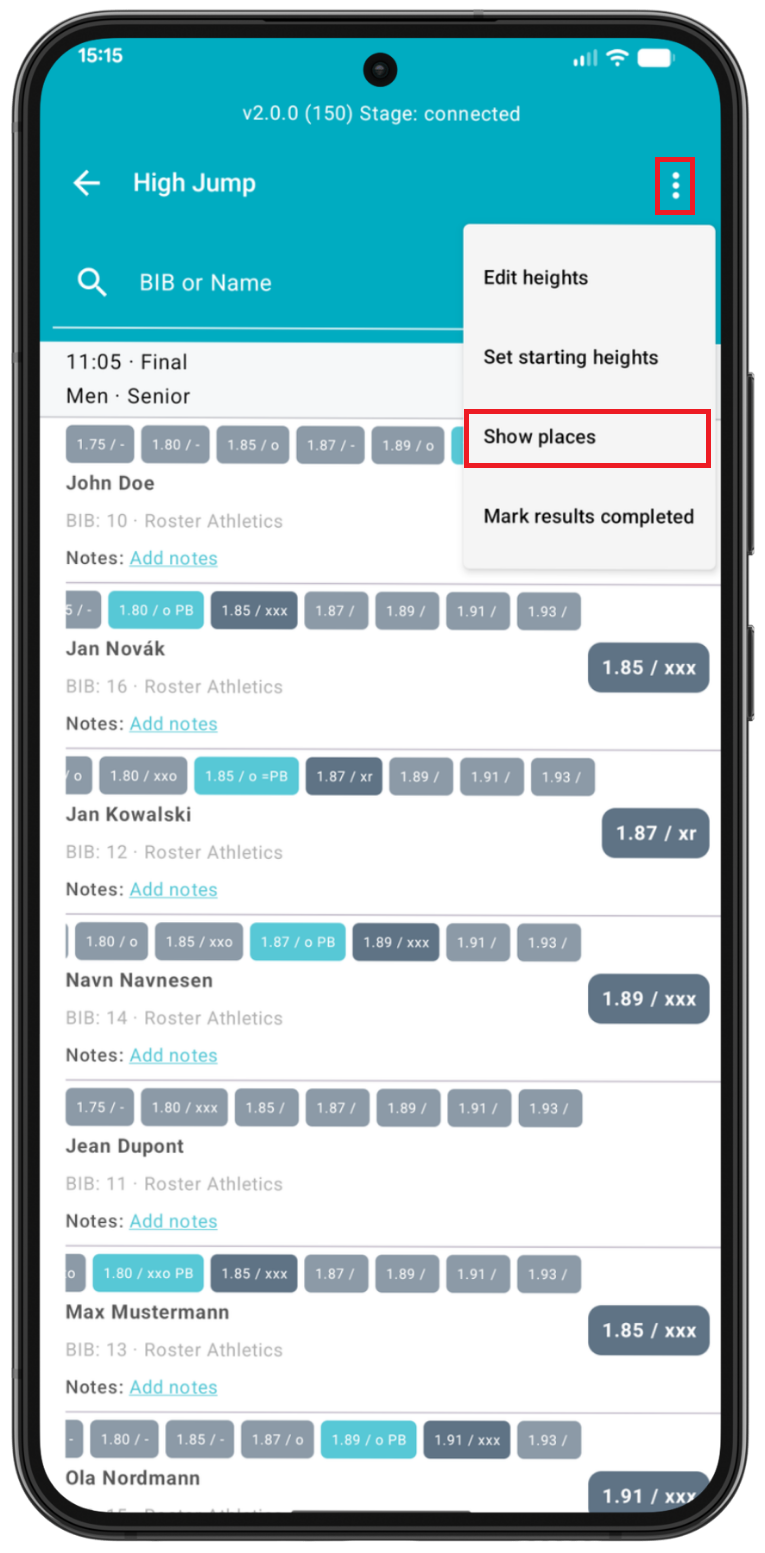 As you enter results, you can view updated place standings during the competition. To do this, press the three dots option on the upper right-hand and select Show places.
