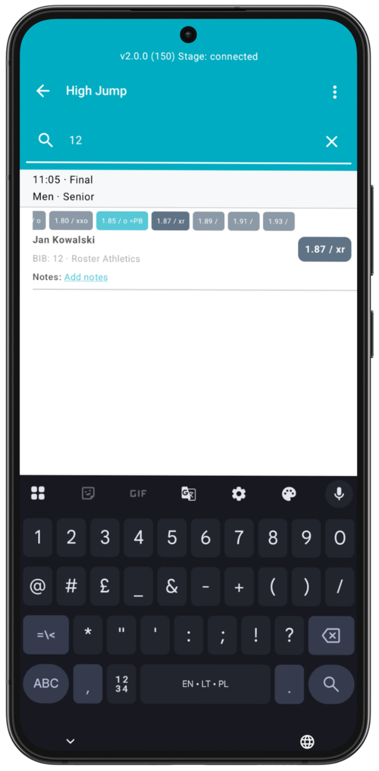During the event, you may need to search for or update the results for a particular athlete. You can find this athlete through the search window in the Event view by entering the athlete's name (first or last) or their associated bib number.