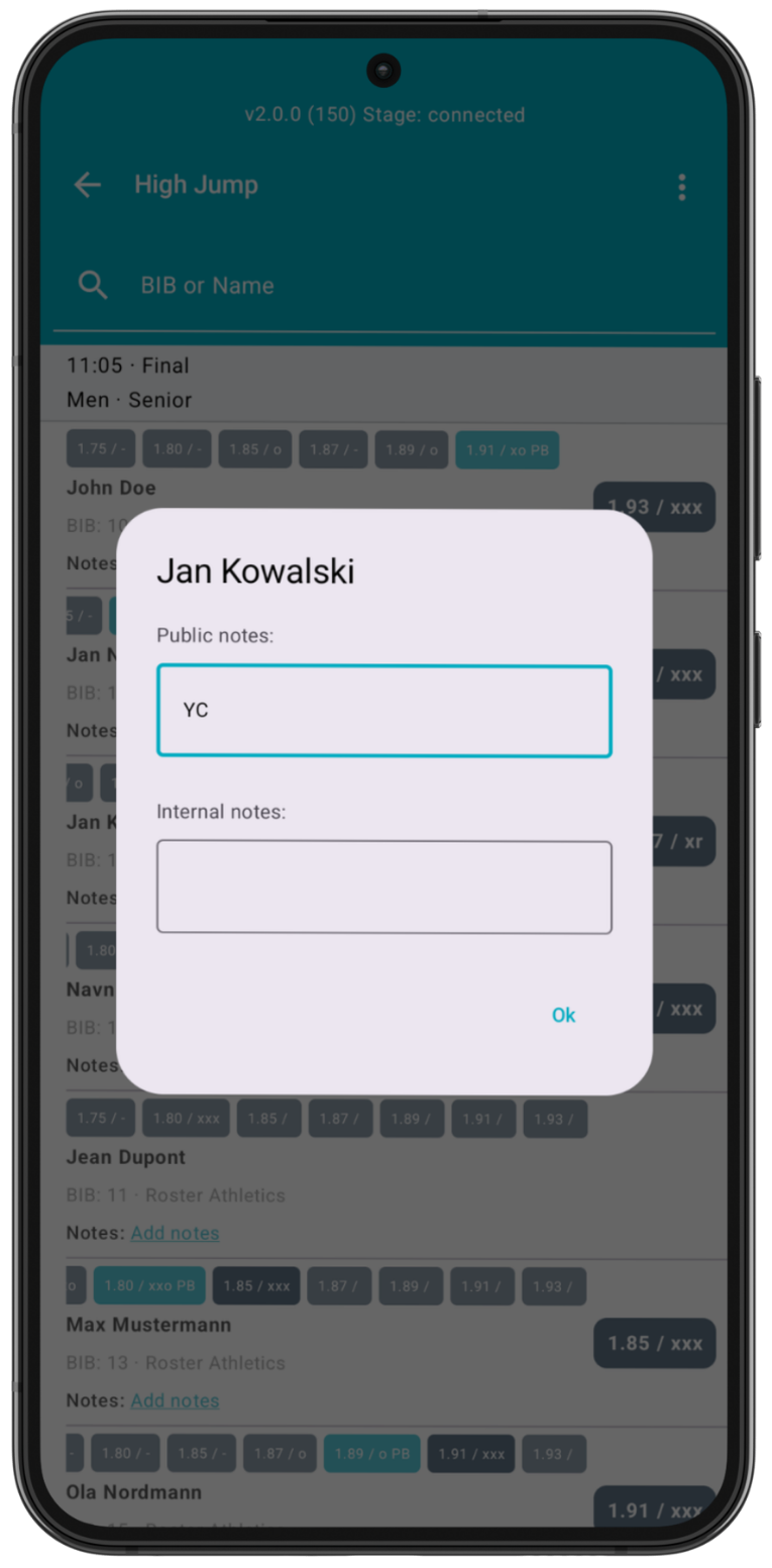 You can add Public notes, which are visible in the Roster Athletics app, the public website with start lists and results (https://meets.rosterathletics.com/), and CSV and PDF files (start lists, results and scoresheets). You can use this field to add information about Yellow Card (YC), Second Yellow Card (YRC), Red Card (RC) and more.