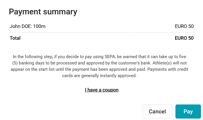 - Payment complete - payment was successful and an athlete/relay is or will be moved to the start list shortly.