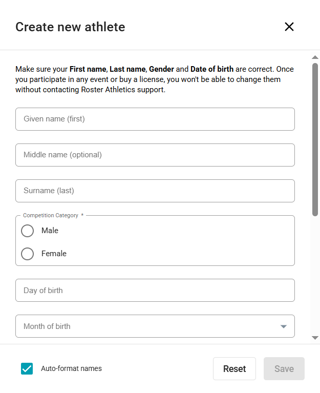 Please note: Make sure the First name, Last name, Gender and Date of birth are correct. Once the athlete participates in any event or buys a license, they won't be able to change them without contacting Roster Athletics support.