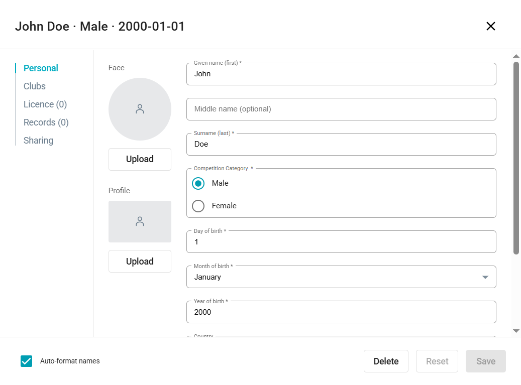 If you have added a new athlete correctly or clicked on the athlete's name in the list, you will see the athlete's profile, which contains a menu with links to Personal, Clubs, Licence, Records, and Sharing.