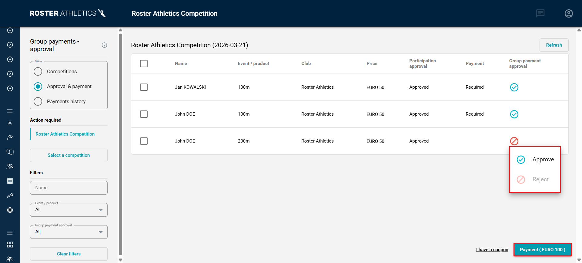After selecting the competition, you'll see a list of all verified members of your club who have registered for it. Select the Approve status in the Group payment approval column to approve payment for the entry. To reject the entry, select Reject. Rejected athletes will have to pay for their participation themselves.