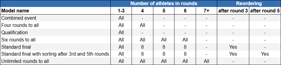 When preparing the competition schedule, you may wish to adjust the number of rounds the athletes attempt in both the qualification and final stages for applicable field events, such as the long jump, triple jump, and all the throwing events. You are able to configure a model for the number of attempts to optimise usage in the Roster Athletics Meet Mgmt app when entering results for these events. You can learn more about selecting models in the Set schedule user guide.