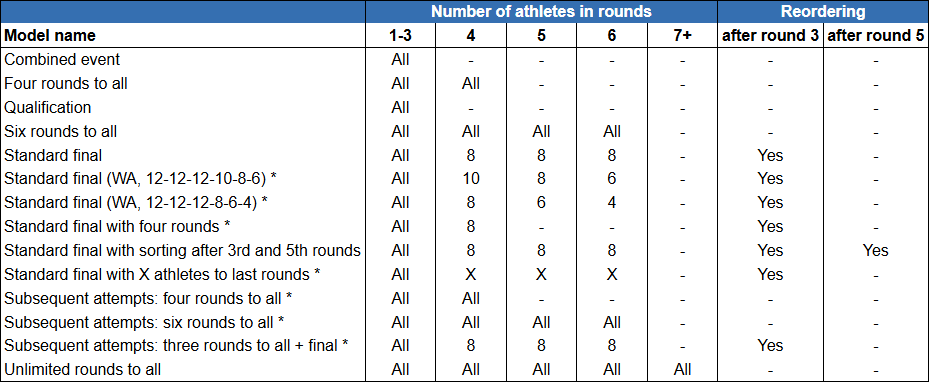 - Standard final with X athletes to last rounds*: the top X athletes advance to rounds 4, 5, and 6, with re-seeding after round 3.