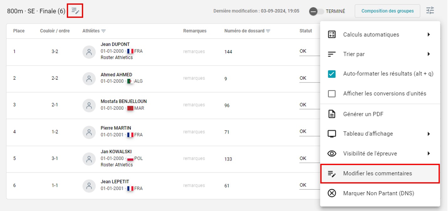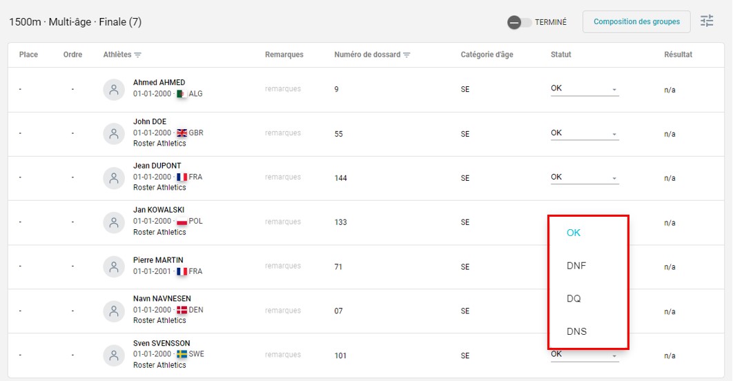 Vous devrez saisir le Statut correct des athlètes. Les options disponibles sont : DNF (ne termine pas la course), DQ (disqualifié(e)) ou DNS (manque au départ).