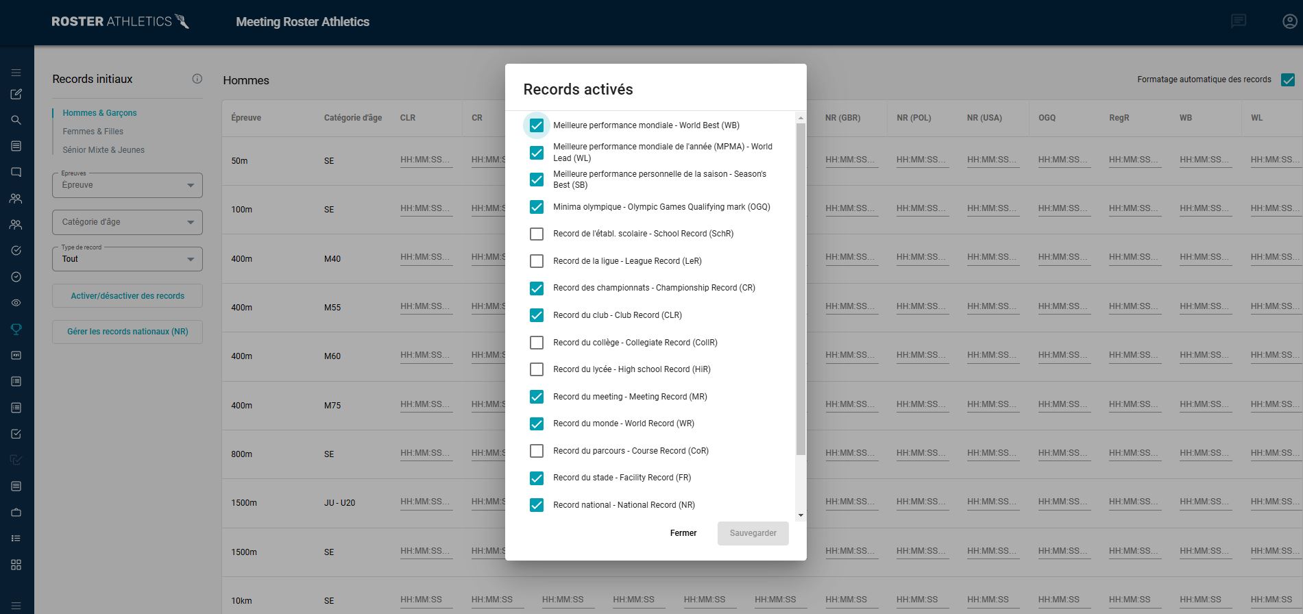 Veuillez noter : Pour activer les records dans le cas d'épreuves mixtes et/ou d'épreuves avec plusieurs catégories d'âge, vous devrez d'abord ajouter des athlètes à la start-list afin de voir les épreuves pour un sexe ou une catégorie d'âge spécifique.
