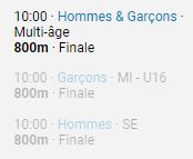 Une fois les affectations effectuées et sauvegardées, toutes les catégories d'âge apparaîtront sous l'en-tête Start-lists. Un résumé de l’épreuve sera affiché en premier (ex. : 800 m - Multi-âge, SE), suivi de chaque catégorie d’âge répertoriée séparément (ex. : 800 m - Multi-âge, MI - U16 et 800 m - SE).
