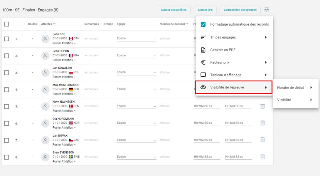 Masquer ou modifier la visibilité des épreuves de votre compétition via le menu à gauche, Meetings → Visibilité de l'épreuve.