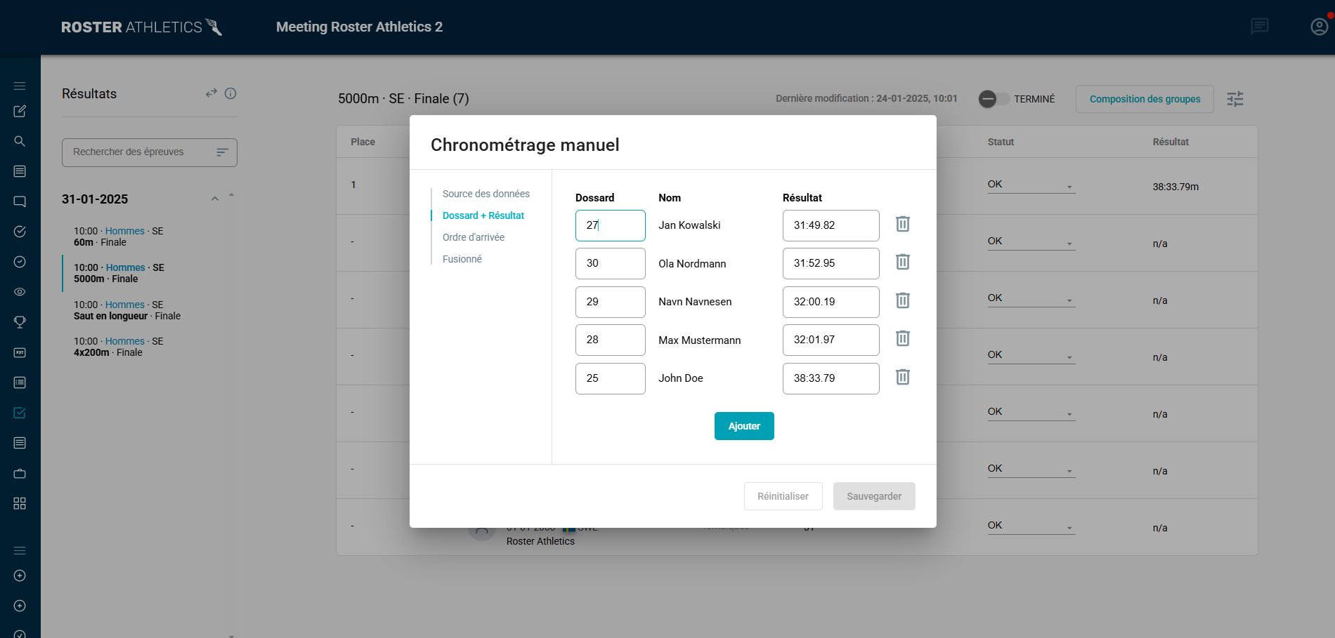 Vous pouvez ajouter, modifier ou supprimer tous les temps dans l'onglet Dossards + Résultats.