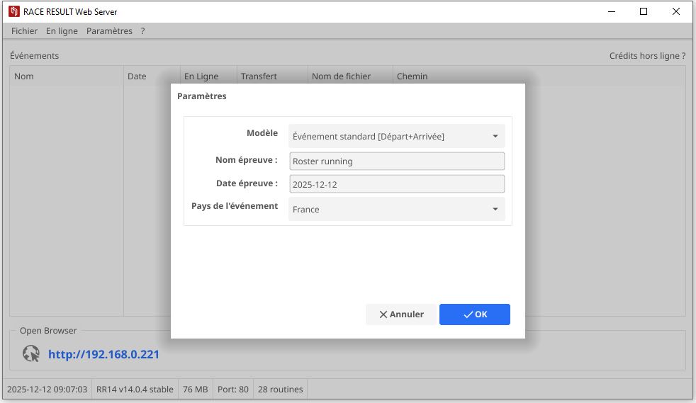Ouvrir RACE RESULT → Fichier → Nouvel événement, puis ajoutez un nom à votre événement/épreuve.