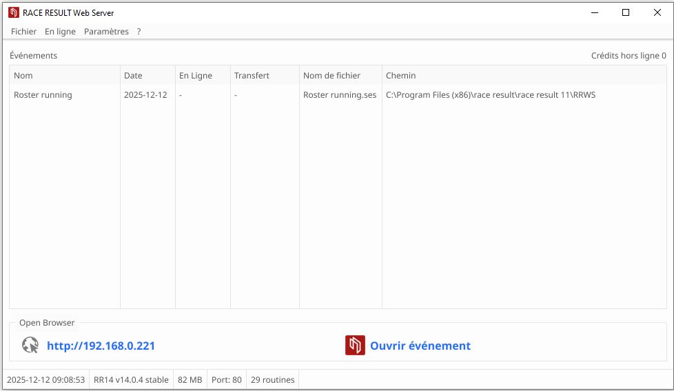 - Le logiciel RACE RESULT doit être téléchargé dans sa nouvelle version (RACE RESULT 14, sortie en décembre 2025) depuis leur site Web. Assurez-vous de le maintenir à jour régulièrement pour bénéficier des nouvelles fonctionnalités, améliorations et corrections.