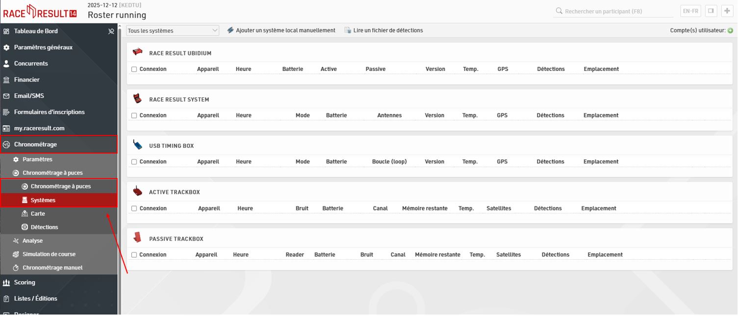 - Accédez à Chronométrage → Chronométrage à puces → Systèmes.