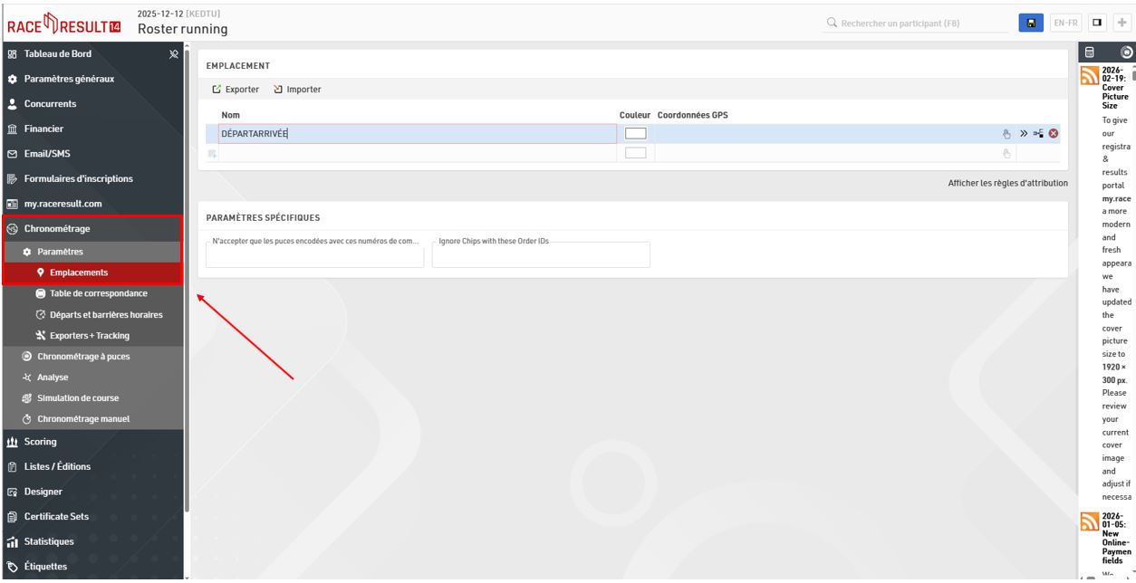 Vous trouverez les Emplacements (Timing points) dans l’onglet Chronométrage → Paramètres → Emplacements, sur le côté gauche de l’écran.