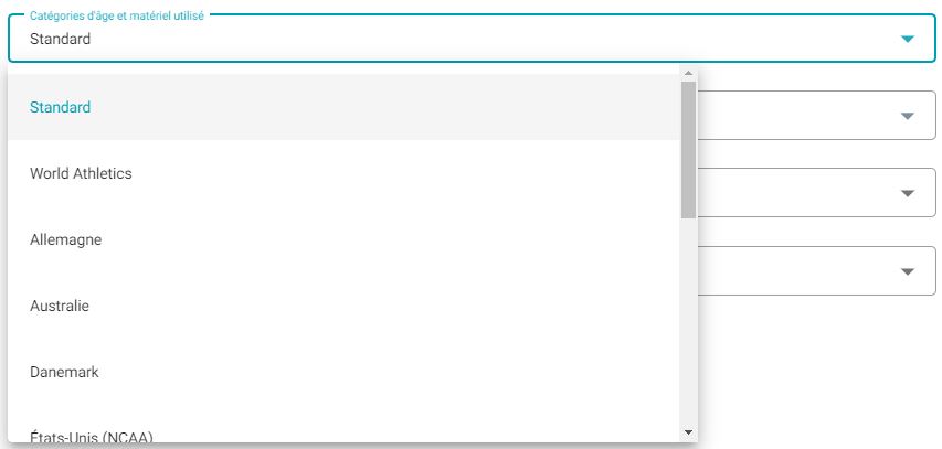 Par défaut, la sélection sera définie dans la configuration Générale. Si vous choisissez un pays ou une organisation spécifique comme World Athletics, les données correspondantes seront utilisées. Important : Vous ne pourrez pas modifier ce champ une fois la course créée. Il est essentiel pour appliquer les bons barèmes de points et les bons facteurs de classement par âge. - Catégorie d'âge par défaut :