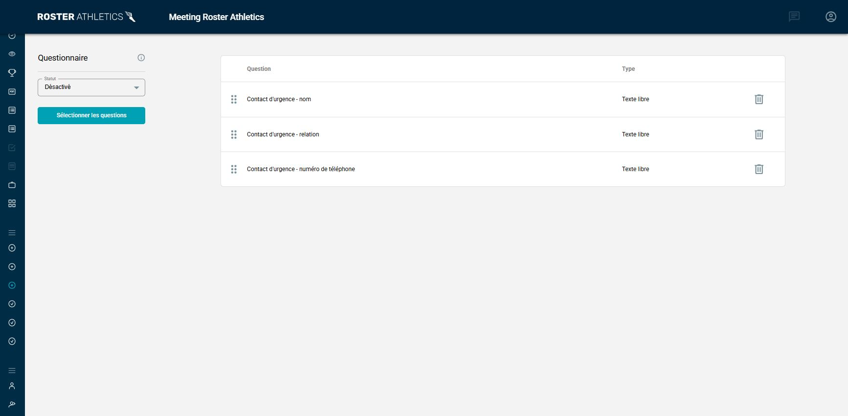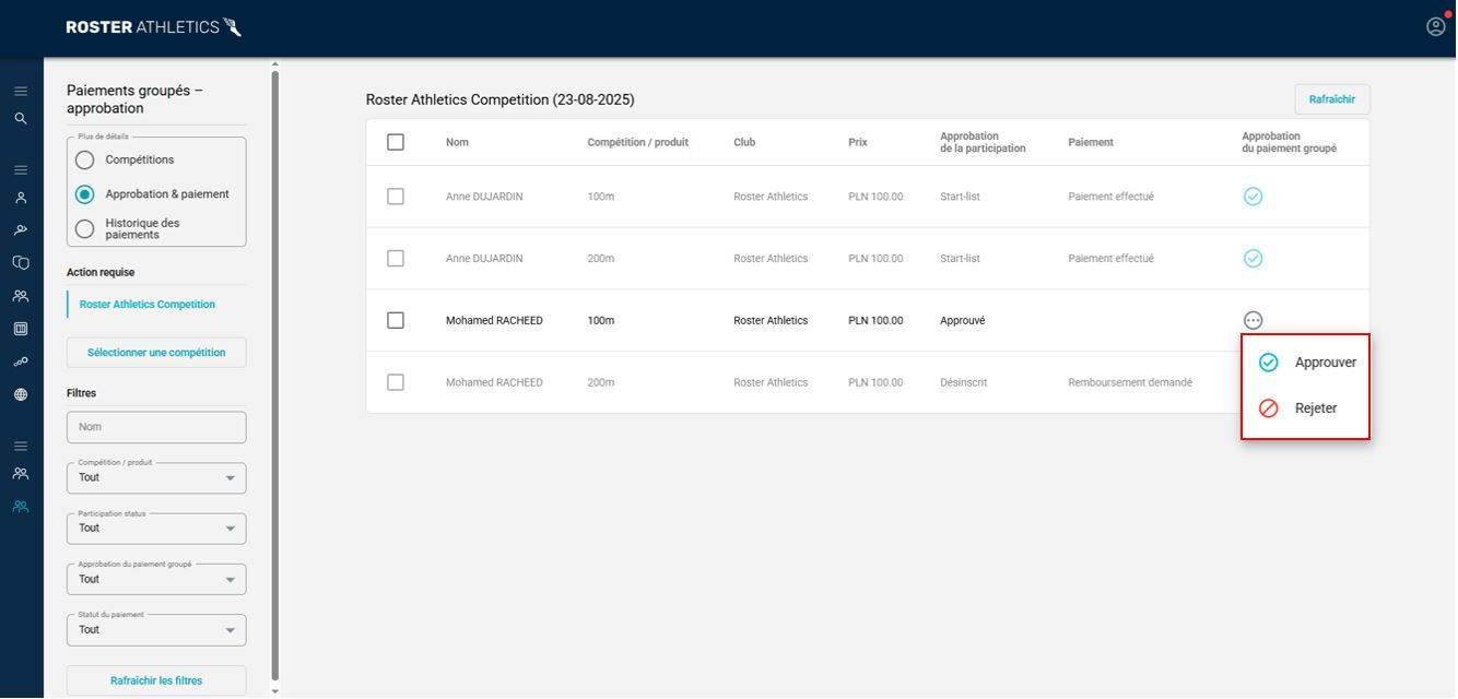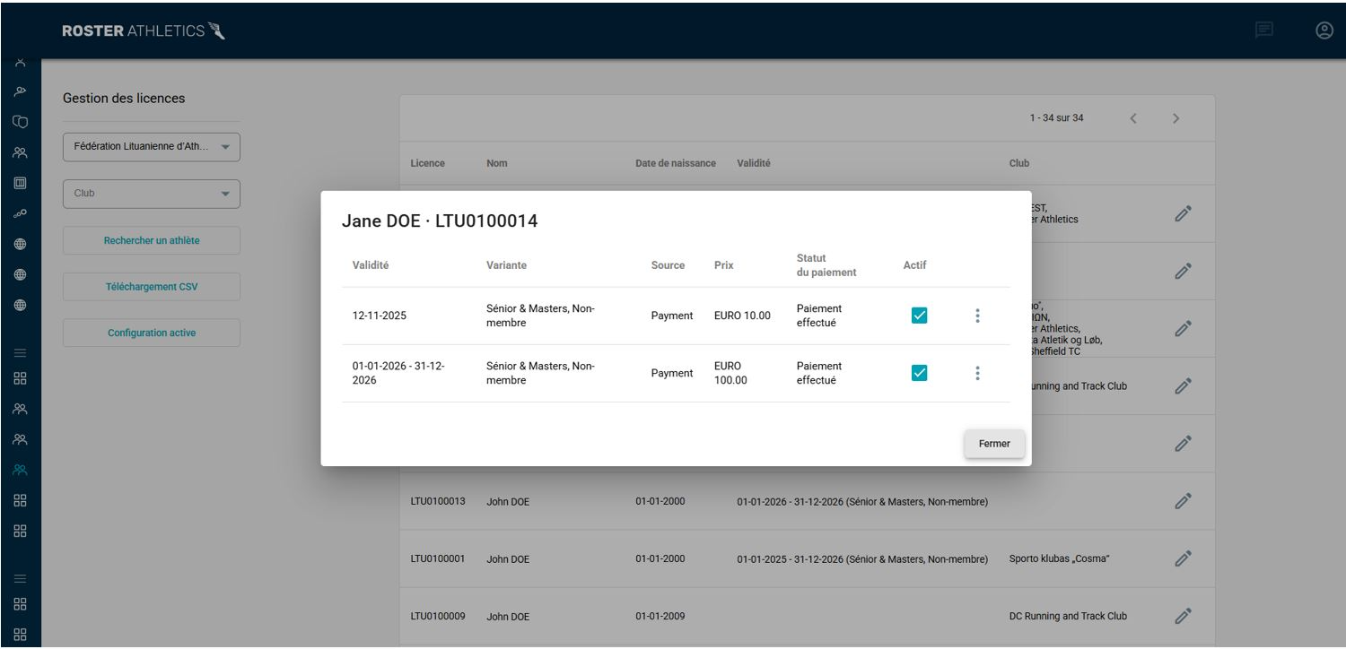 - Licences : Nous avons ajouté la possibilité de gérer les licences des athlètes dans le système Roster Athletics. Les athlètes peuvent désormais ajouter et payer leurs licences dans le portail d’inscription, tandis que les fédérations peuvent gérer les licences dans le système d’administration.