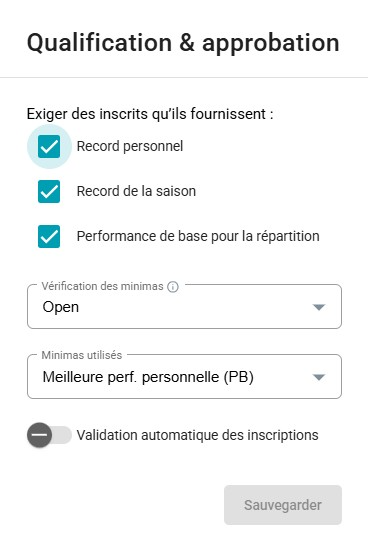- Inscription : Les organisateurs peuvent désormais sélectionner les types de performances (PB, SB ou PBR) que les participants peuvent saisir lors de leur inscription à une compétition.
