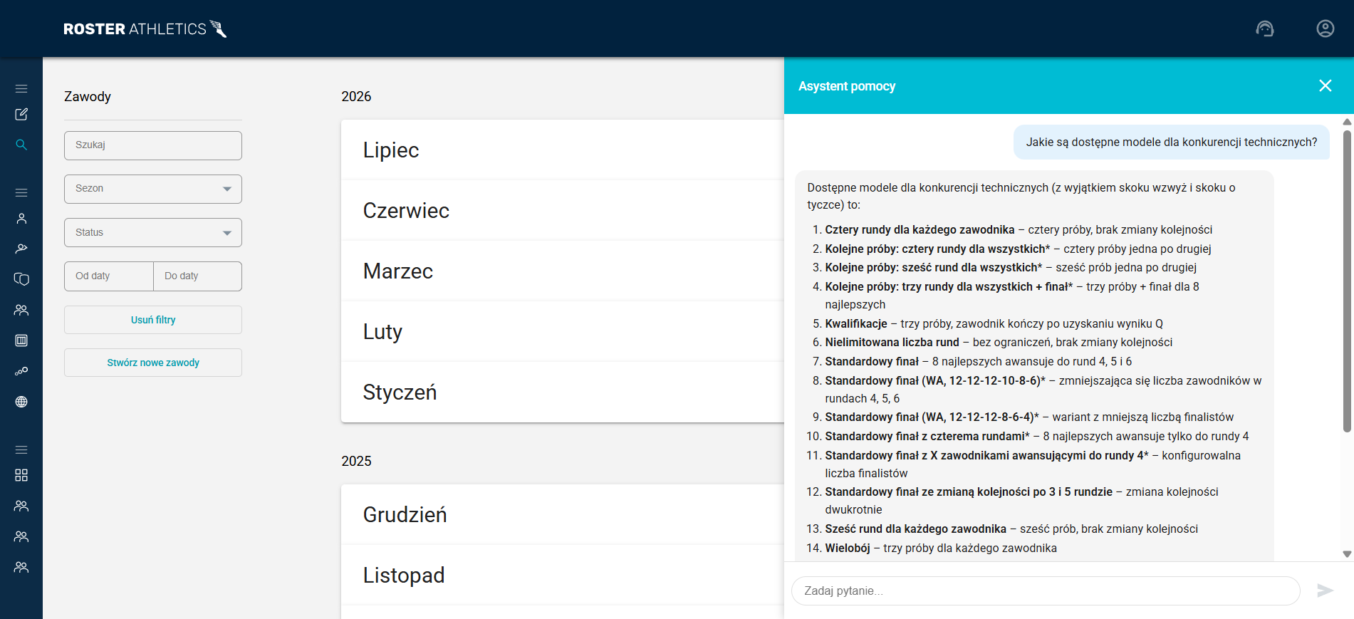 - Asystent pomocy: Do serwisu administracyjnego dodano asystenta, który udzieli odpowiedzi na pytania dotyczące Roster Athletics. Kliknij ikonę w prawym górnym rogu, zadaj pytanie, a asystent pomoże Ci znaleźć właściwą odpowiedź, korzystając z naszej bazy wiedzy.