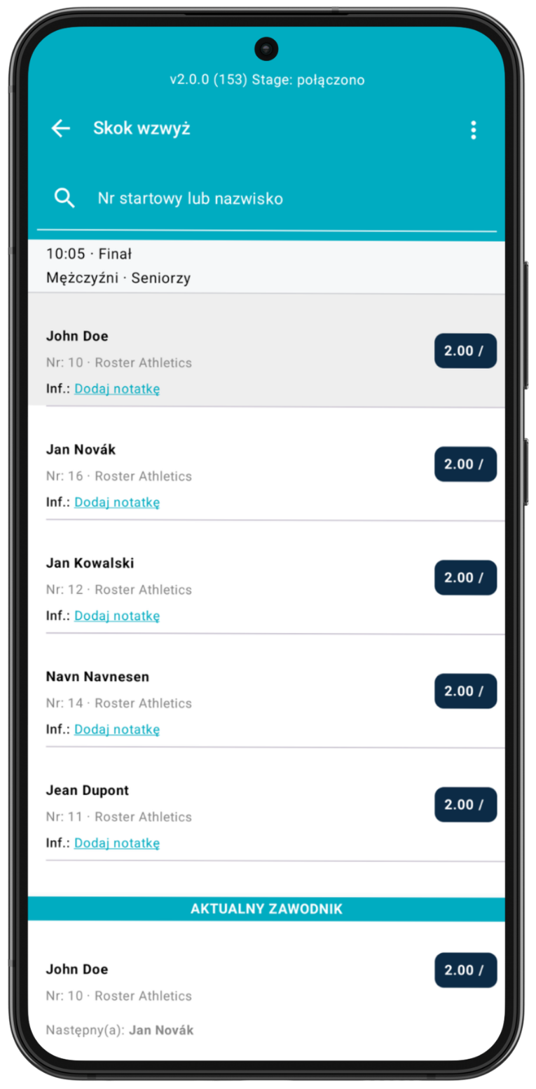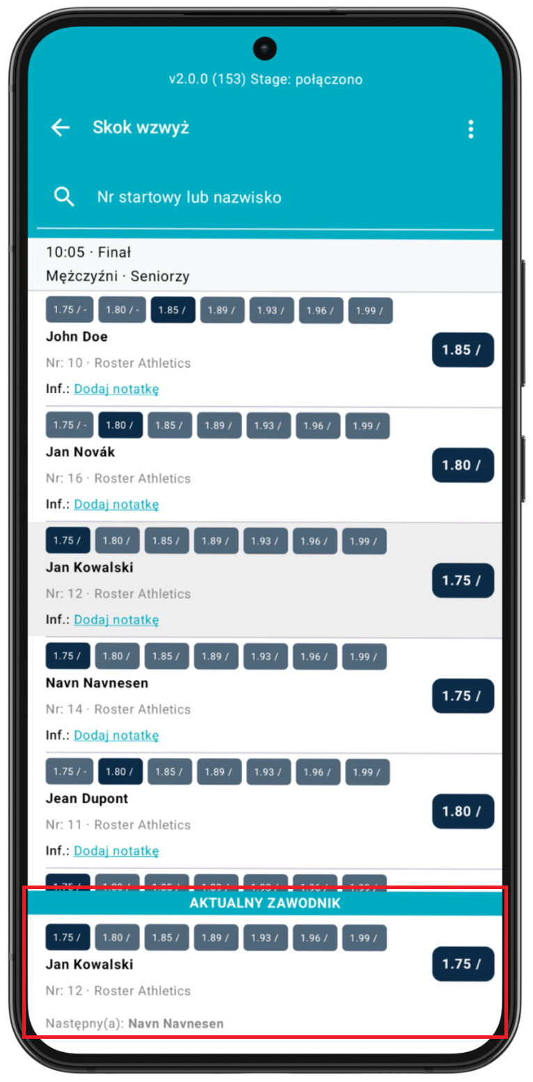 Po ustawieniu wysokości i określeniu wysokości startowych można rozpocząć dodawanie wyników. Zawodnik aktualnie wykonujący próbę widoczny jest w dolnej części ekranu w polu AKTUALNY ZAWODNIK.
