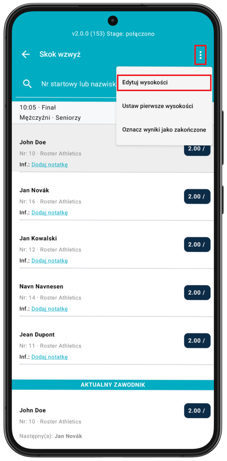 Przed rozpoczęciem konkurencji ustaw planowane wysokości. Aby to zrobić, kliknij ikonę trzech kropek w prawym górnym rogu ekranu i wybierz Edytuj wysokości.