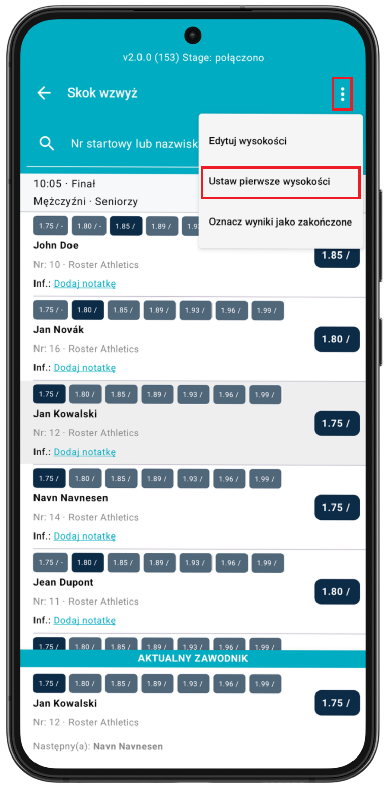Przed rozpoczęciem dodawania wyników należy skonfigurować wysokości oraz określić pierwszą wysokość dla każdego zawodnika.