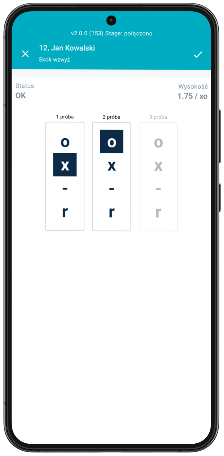 Po otwarciu ekranu wprowadzania wyniku zobaczysz trzy możliwe próby dla danej wysokości. Każdą próbę można oznaczyć odpowiednim symbolem: