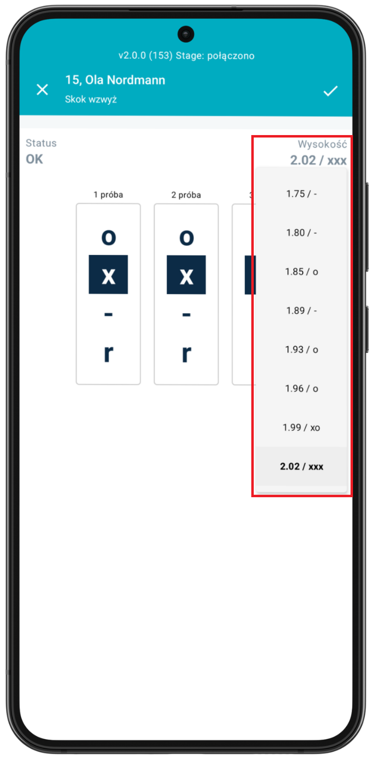 Powtórz ten krok dla kolejnych zawodników. Po przypisaniu wszystkich wysokości kliknij ikonę ✓, aby zapisać zmiany, lub ✕, aby opuścić widok bez zapisywania.