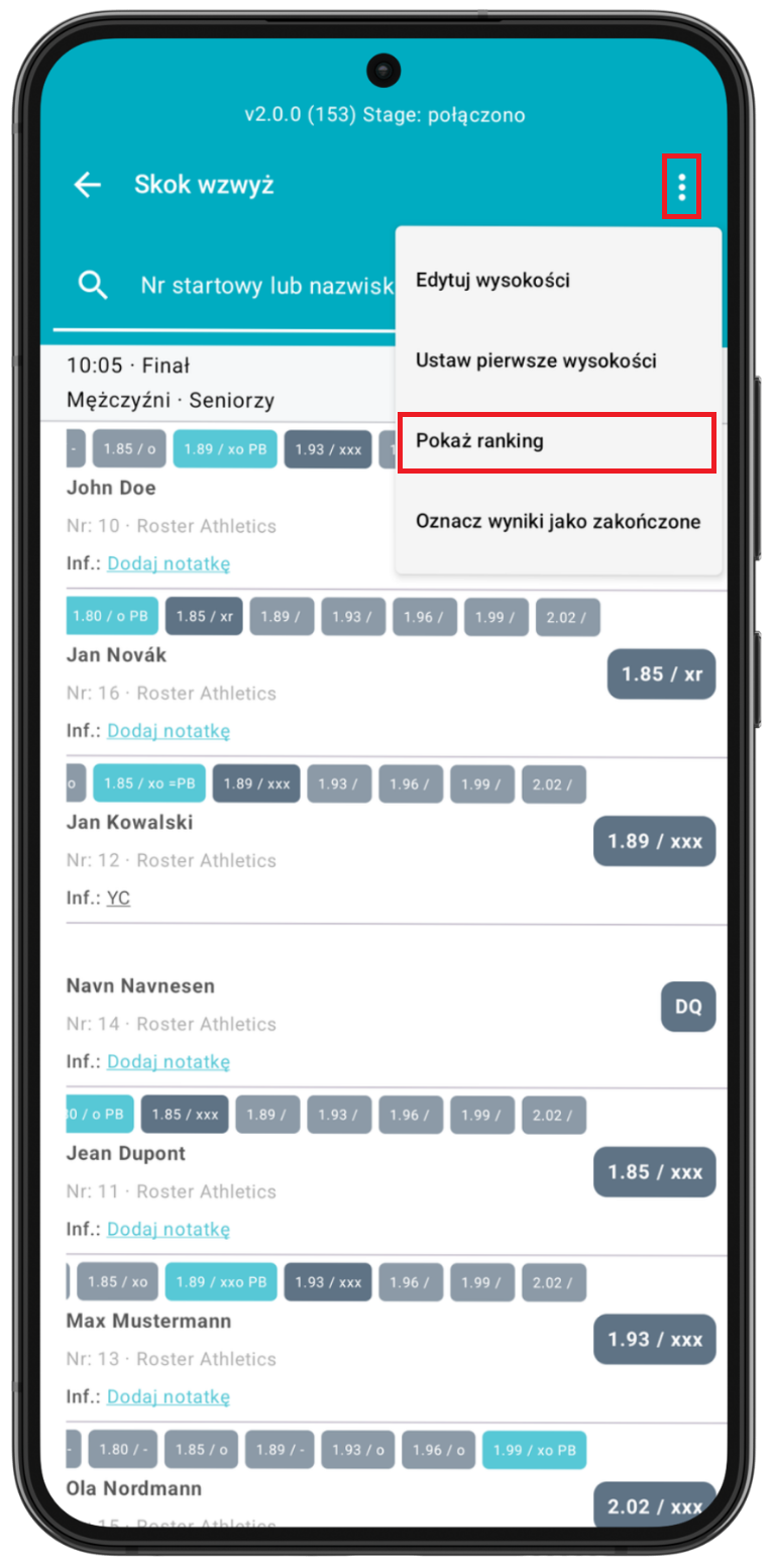 Po wprowadzeniu wszystkich wyników (lub nawet pojedynczego rezultatu) możliwe jest sprawdzenie aktualnego rankingu. Aby to zrobić, kliknij ikonę trzech kropek w prawym górnym rogu ekranu i wybierz Pokaż ranking.