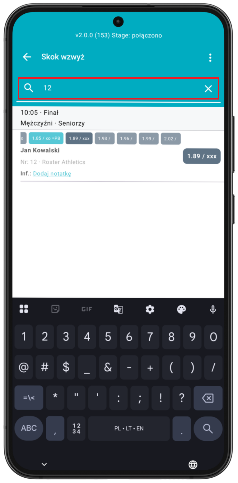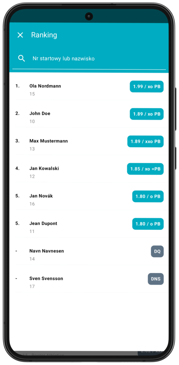 Podczas wprowadzania wyników w konkurencjach z dużą liczbą zawodników pomocne może być użycie wyszukiwarki. Wpisanie nazwiska lub numeru startowego pozwala szybko odnaleźć właściwego zawodnika.