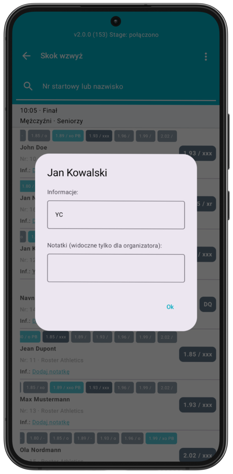 Możesz dodać Informację publiczną, która będzie widoczna w aplikacji mobilnej Roster Athletics, aplikacji sędziowskiej, na stronie internetowej z listami startowymi i wynikami oraz w plikach CSV i PDF (listy startowe, wyniki i protokoły do wypełniania). Pole to może służyć m.in. do oznaczeń: żółta kartka (YC), druga żółta i w konsekwencji czerwona kartka (YRC), czerwona kartka (RD), przekroczenie toru (L) i innych.