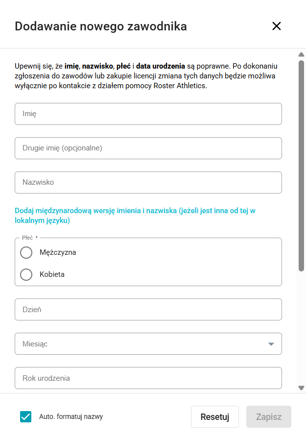 UWAGA: Przed zapisaniem, upewnij się, że imię, nazwisko, płeć i data urodzenia są poprawne. Po dokonaniu zgłoszenia do zawodów lub zakupie licencji zmiana tych danych będzie możliwa wyłącznie po kontakcie z działem pomocy Roster Athletics.