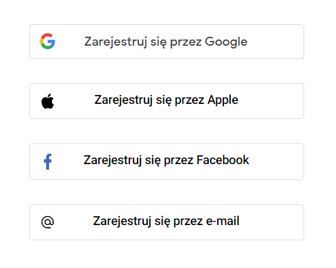 Jeśli Twój wiek spełnia warunki do założenia konta, możesz zdecydować, czy chcesz zarejestrować się za pomocą konta Google, Apple, Facebook, czy za pomocą adresu e-mail. Jeśli zdecydujesz się zarejestrować za pomocą adresu e-mail, nadal będziesz mógł/mogła połączyć swoje konto Google, Apple, Facebook w ustawieniach konta po jego utworzeniu.
