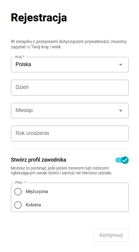 Podczas tworzenia konta możesz również automatycznie stworzyć swój profil uczestnika. Wystarczy pozostawić przełącznik włączony i wybrać swoją płeć. Jeśli jesteś rodzicem lub trenerem, możesz utworzyć profile uczestników dla swoich dzieci lub zawodników po założeniu konta.